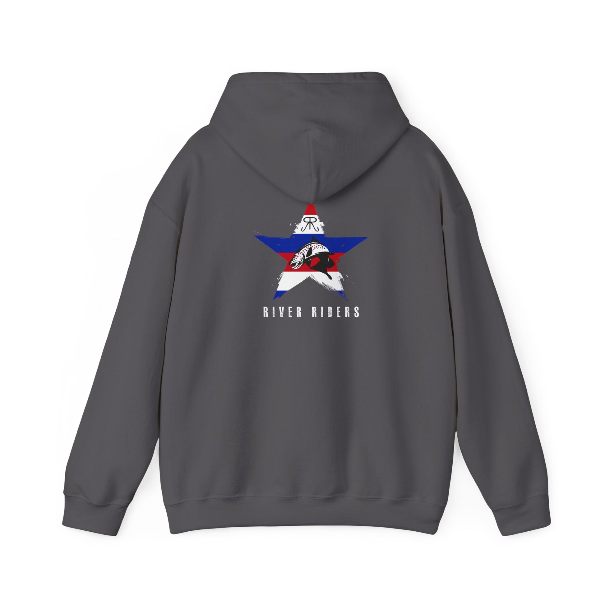 Get ready to embrace your patriotic side with the River Riders 'Merica hoodie! Featuring a trout adorned with stars and surrounded by the classic red, white, and blue, this hoodie will make you feel like shouting "'Merica!" from the mountain tops. Don't be shy cowboy!
